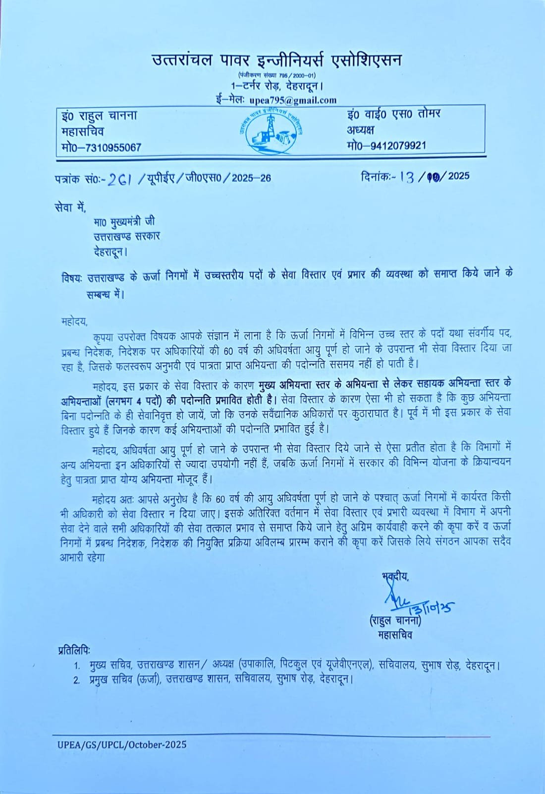 एसोसिएशन के महासचिव इंजीनियर राहुल चनाना ने मुख्यमंत्री को पत्र भेजकर कहा है कि ऊर्जा निगमों में 60 वर्ष की आयु पूरी करने के बाद भी कई उच्चाधिकारियों को सेवा विस्तार दिया जा रहा है. इससे विभागीय पदोन्नति प्रक्रिया बाधित हो रही है. वरिष्ठ अभियंताओं को उनके योग्य पद नहीं मिल पा रहे हैं.
