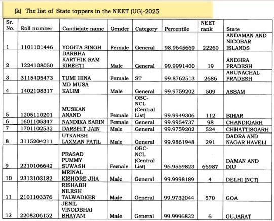 मुस्कान आनंद बनीं बिहार टॉपर: हालांकि इस बार टॉप-100 में एक भी बिहार का छात्र नहीं है. वहीं मुस्कान आनंद नीट यूजी 2025 परीक्षा में बिहार स्टेट टॉपर बनी हैं. ऑल इंडिया रैंकिंग में उनका 112वां स्थान है और परसेंटाइल 99.9949306 है.